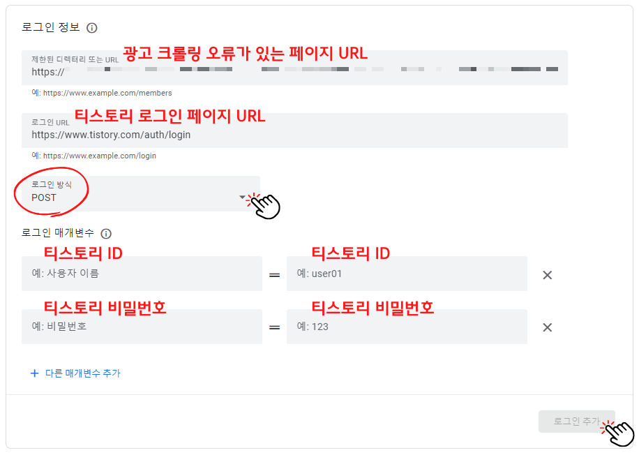 - 로그인 매개변수(아이디,비밀번호 2번씩 입력) : 사용자 이름 = 티스토리 아이디, 비밀번호 = 티스토리 비밀번호