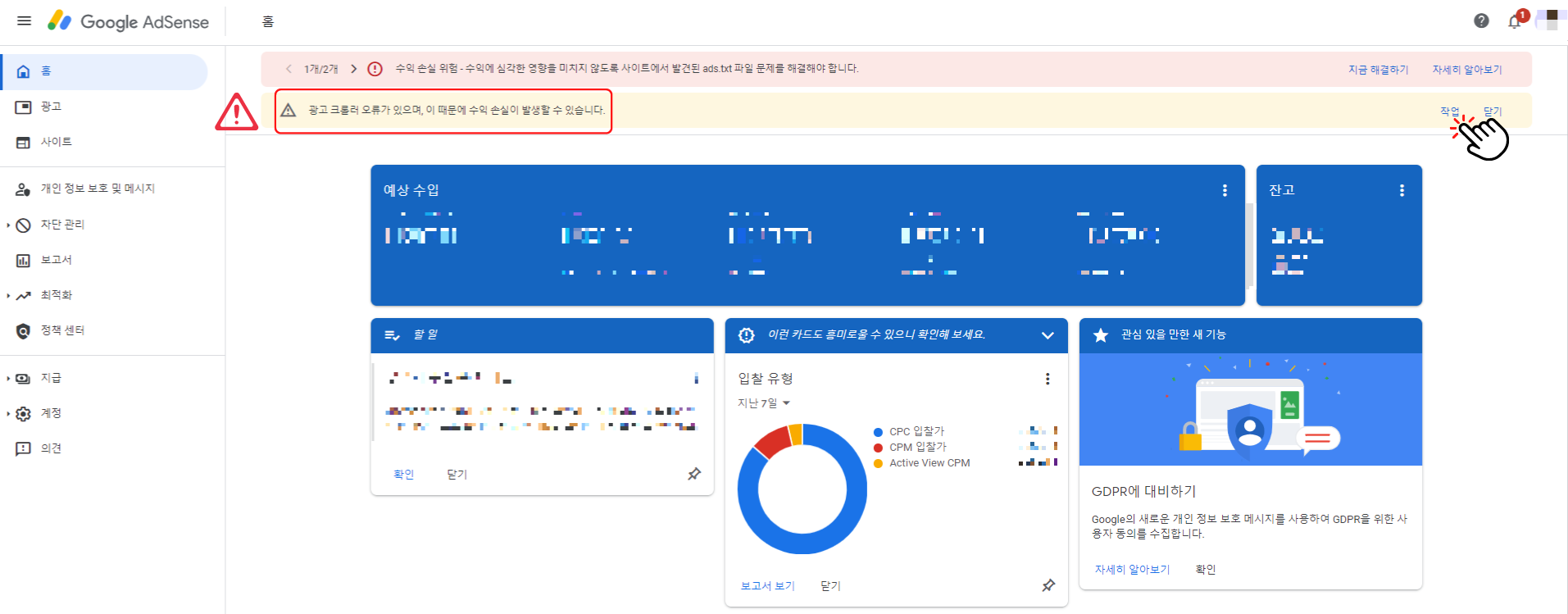 1. 애드센스에 접속하여 다음 스크린샷과 같이 오류가 떠있다면, 광고 크롤러 오류가 발생한 것 입니다.