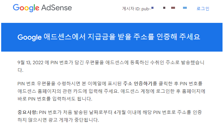 애드센스를 통한 수입이 10달러가 넘으면 구글 애드센스로부터 메일이 옵니다. PIN 번호가 담긴 우편물을 애드센스에 등록한 주소로 발송했다는 내용으로, 우편물 수령 후 주소 인증을 하라고 기재되어 있습니다.