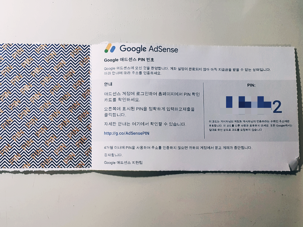 구글 애드센스에서 9월 13일 PIN 번호 우편을 발송했고, 실제 수취 일은 10월 6일로 우편을 받기까지 총 24일 걸렸습니다. 해외에서 배송되기 때문에 빨리 받으신 분들은 우편발송 후 2주 만에 받기도 하지만 보통은 3~4주 사이에 받는 것 같습니다. 수취하기 전까지 혹시 늦게 받지는 않을지 걱정되어 오매불망 기다렸기에 받고 나서 기쁨이 배가 되었습니다.