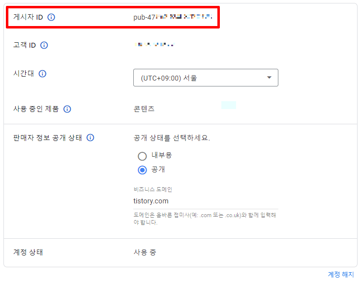 - 게시자 ID 확인 방법 : 애드센스 > 계정 > 계정 정보 > 게시자 ID