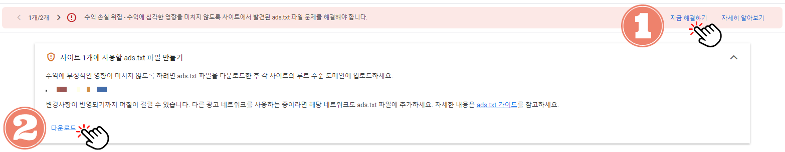 1. 애드센스 접속 : 오류창 오른쪽에 지금 해결하기 > 다운로드 클릭