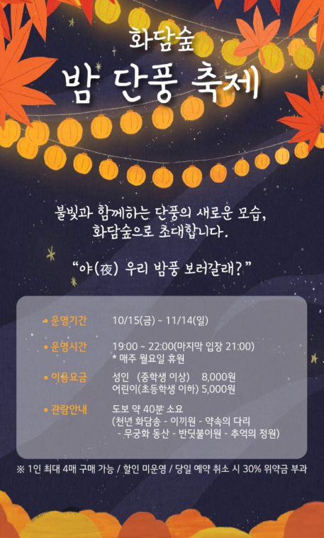 • 운영시간 :  10월에는 휴원이 없으며, 단풍이 절정을 이루는 시기에는 찾는 방문객이 많아 주말에 1시간 일찍 관람 가능합니다.