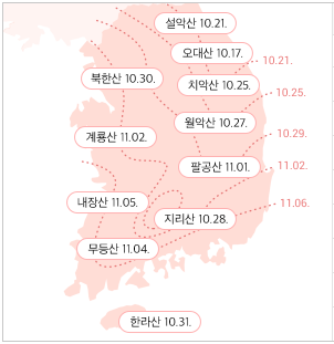 | 산이름 | 첫 단풍 시기 | 단풍 절정기 |