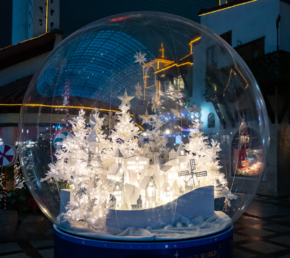 하얀 눈이 소복히 내려 북유럽 감성이 가득 나는 마을과 화이트 트리가 들어있는 대형 스노볼과 함께 특별한 추억을 남길 수 있습니다.
